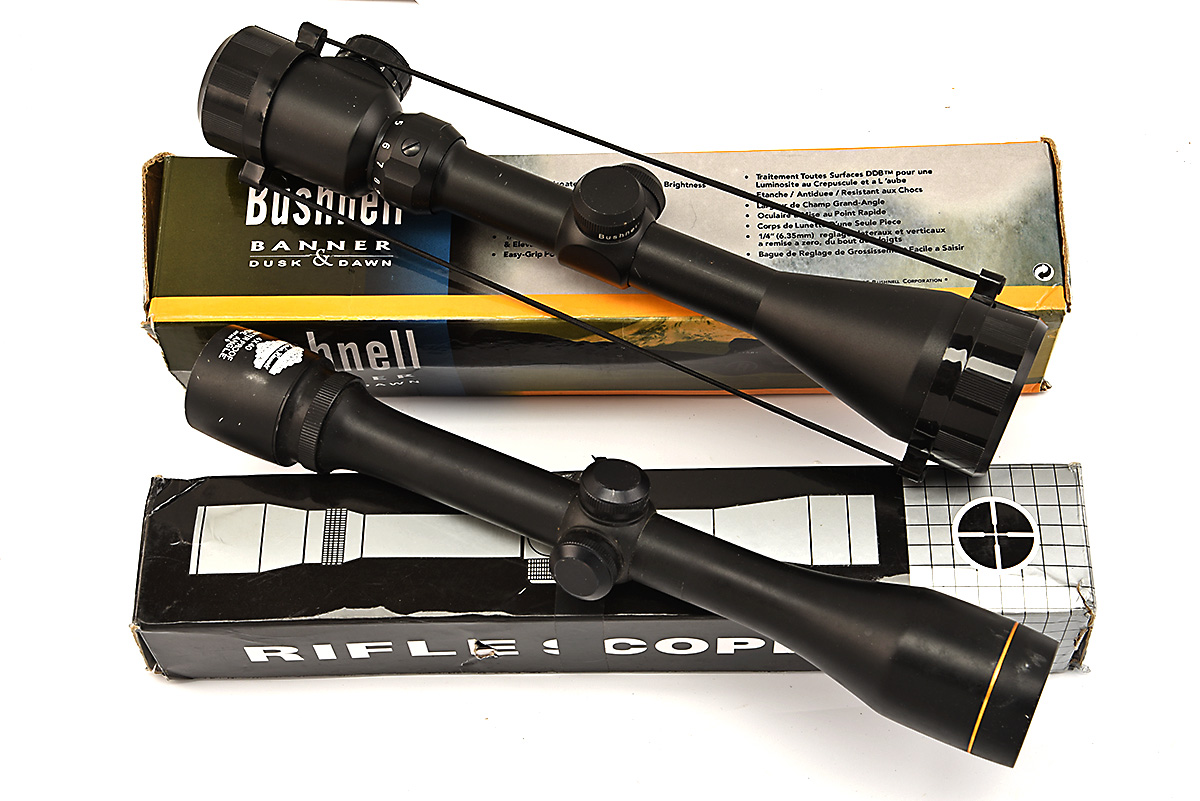 A PAIR OF RIFLE SCOPES IN BOXES '4 X 40 LESLIE HEWETT' RIFLE SCOPE, 'BUSHNELL BANNER' 3-9 X 50E' SCOPE 2
