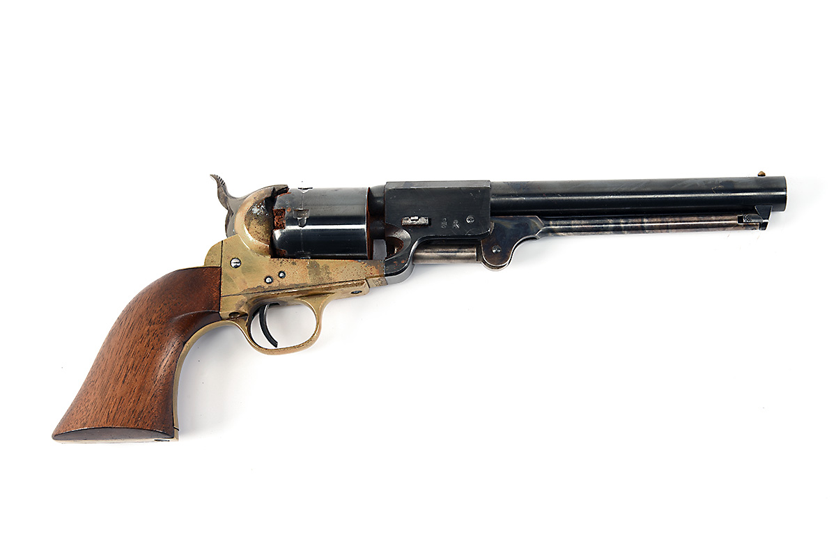 A REPRODUCTION UBERTI REBEL NAVY .36 PERCUSSION REVOLVER, serial no. 103705, with blued octagonal to round 7 1/2in. barrel, plain blued cylinder, open brass frame and smooth walnut grip, finish corroded