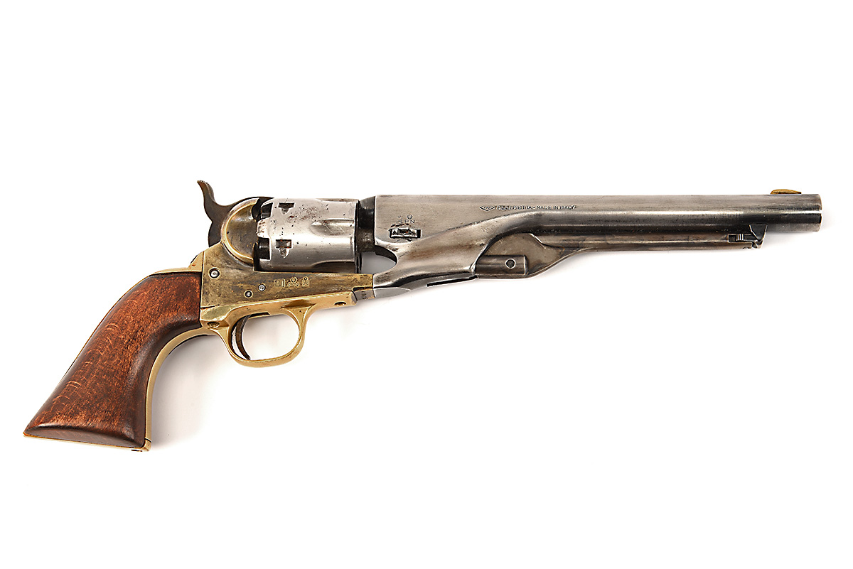 A REPRODUCTION PIETTA COLT-TYPE .36 PERCUSSION REVOLVER, serial no. 410415, with 1861 style 8in. round barrel, fluted cylinder, open brass frame and walnut one-piece grip, most;ly cleaned of finish