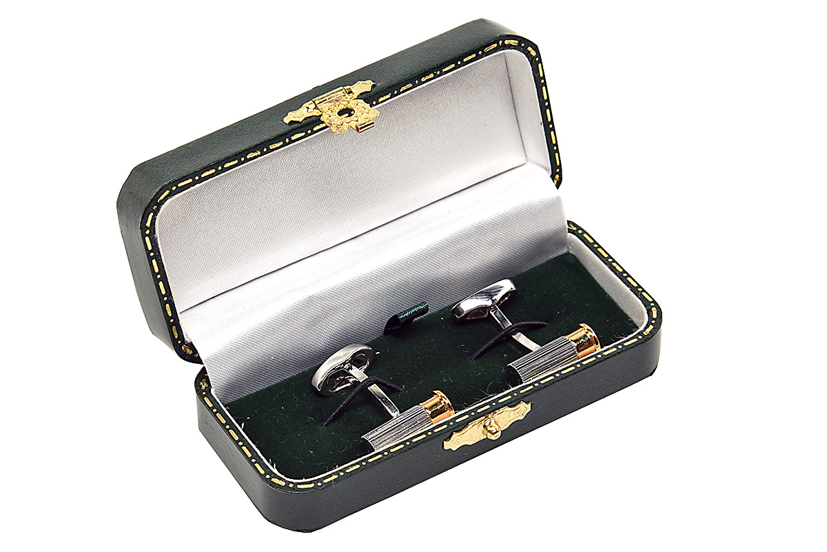 A PAIR OF BI-METAL CARTRIDGE CUFFLINKS, headstamped 'Holland and Holland' in a broken box