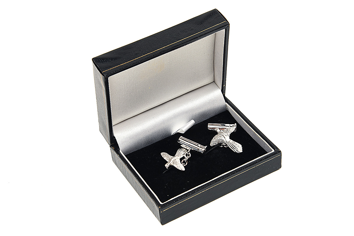 A PAIR OF 925 SILVER PHEASANT AND CARTRIDGE CHAIN CUFFLINKS, in a box