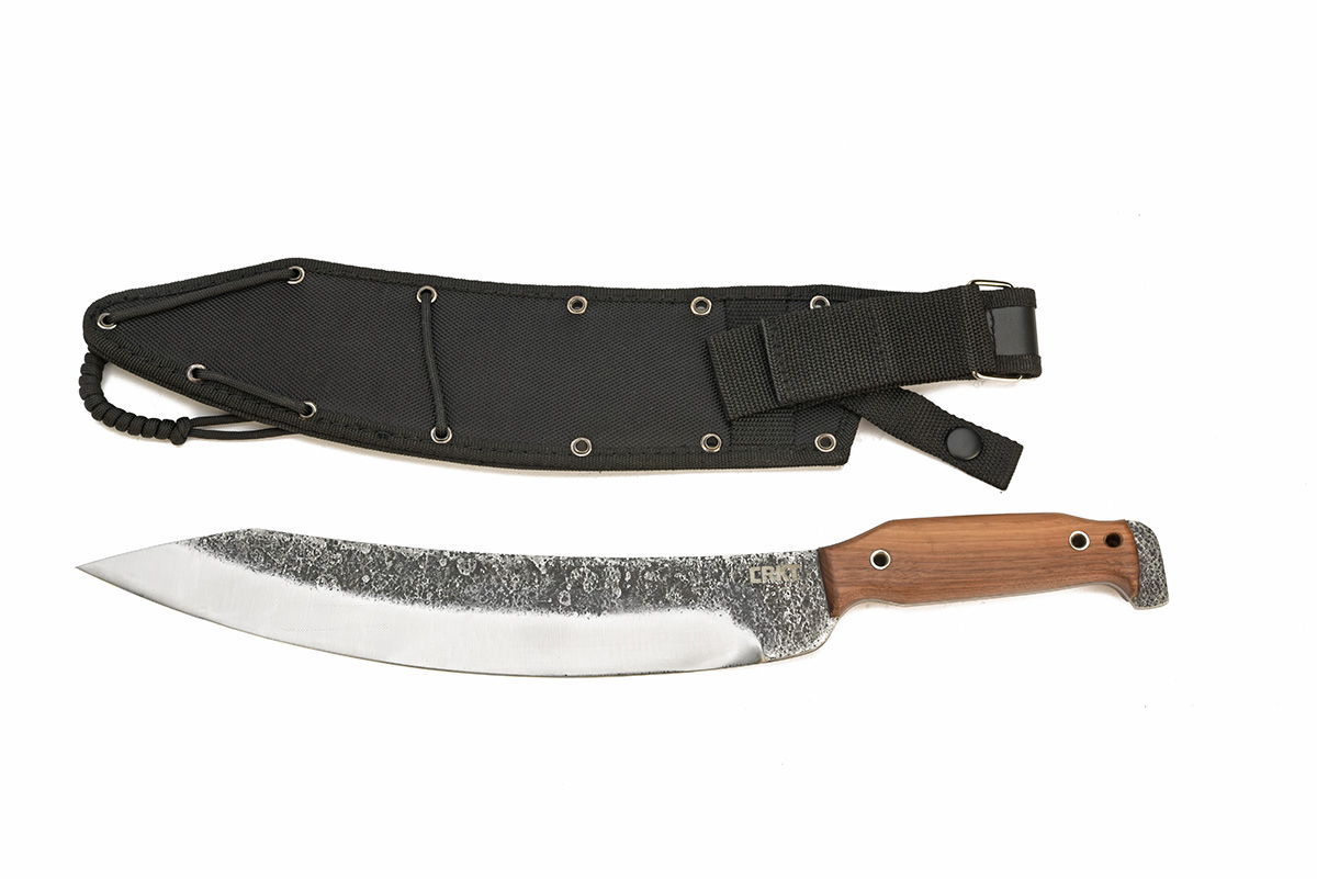 FOUR BOXED CRKT SHEATH-KNIVES, including a Mah-Chete, a Saker Bushcraft (some storage staining), an OC3 Fixed Blade and a Ken Onion Skinner, all apparenty unused in their manufacturers card cartons with scabbards
