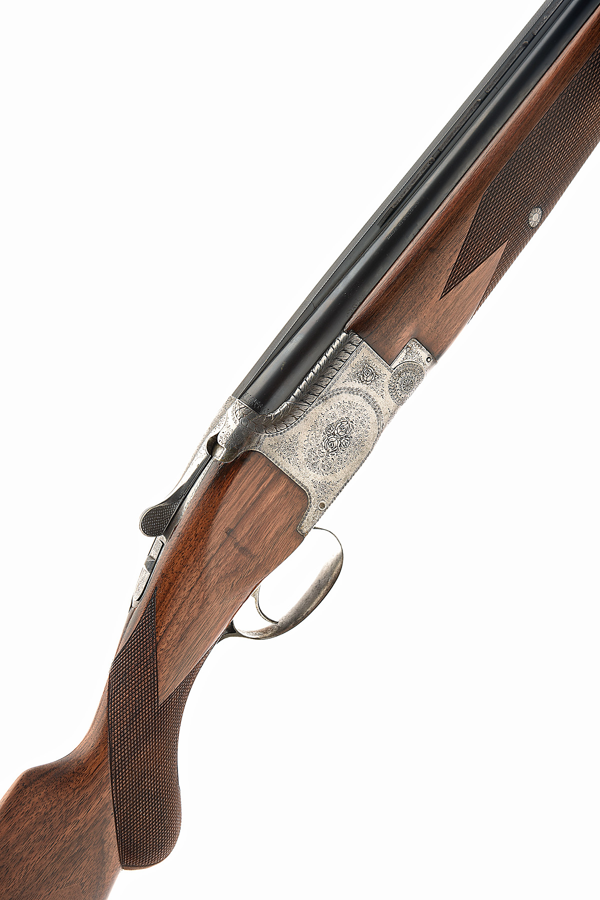 FABRIQUE NATIONALE 12-BORE 'B1' SINGLE-TRIGGER OVER AND UNDER EJECTOR, serial no. 43873, for 1955, 30in. nitro barrels with 7mm ventilated matt top-rib, 2 3/4in. chambers, bored approx. 1/4 choke in both, hold-open toplever, manual safety with integral barrel selector switch, border and acanthus scroll engraving surrounding a central floral bouquet, brushed finish, 15in. semi-pistolgrip stock including 3 3/8in. wooden extension and rubber recoil pad, weight 7lb. 13oz.