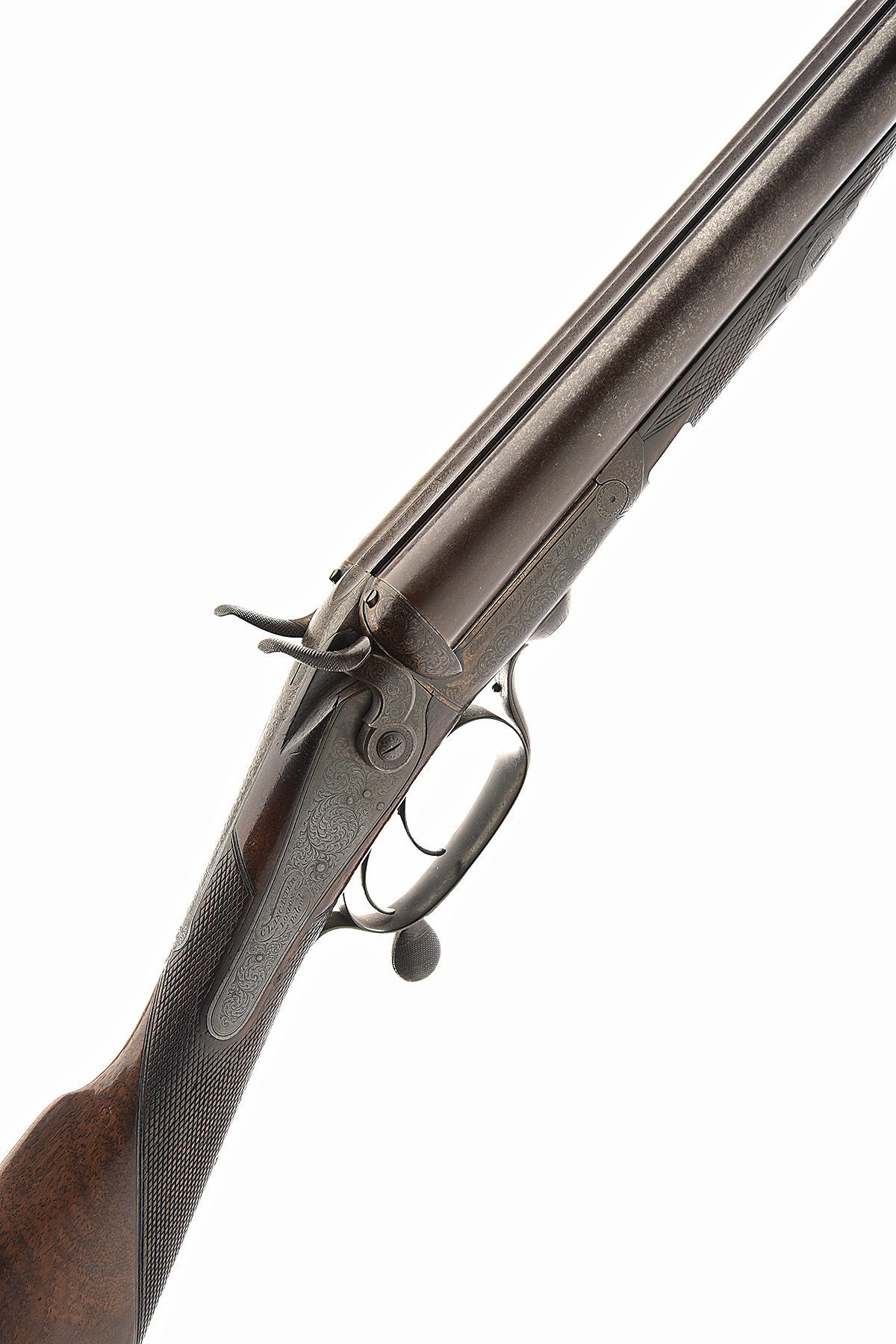 CHARLES LANCASTER 12-BORE ROTARY-UNDERLEVER SLIDE-AND-TILT HAMMERGUN, serial no. 3386, circa 1861, 26in. black powder only damascus barrels (shortened, some pits and dents), rib engraved 'CHARLES LANCASTER. 151 NEW BOND ST. LONDON. PATENT BREECH LOADER' (worn), 2 1/2in. chambers, bored approx. true cyl. in both, Charles Lancaster patent slide-and-tilt action with rotary-underlever, recessed bosses, striker discs, non-rebounding back-action locks with high-spurred hammers of hare's-ear form, the breasts of the hammers hitting the strikers, bold acanthus scroll engraving, the lockplates with 'C. LANCASTER LONDON PATENT' in scrolling banners, the action bar with 'CHARLES LANCASTER'S PATENT', the triggerguard tang with three pheasants, 14 1/4in. stock with steel buttplate (some repairs to woodwork), weight 7lb. 3oz.