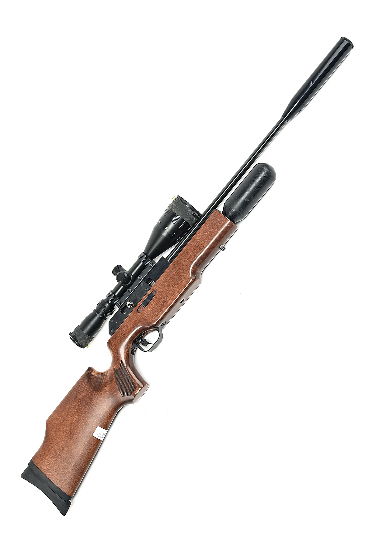 A CASED .22 BSA SUPER-TEN PRE-CHARGED PNEUMATIC AIR-RIFLE, serial no. DP03055, with blued 24in. barrel including sound-moderator, blued bolt-action receiver, beech right hand half-stock, including two additional spare magazines and a spare buddy-bottle, fitted with a BSA Contender 3-12x56 telescopic sight and together with an abs plastic hard carry-case, untested