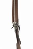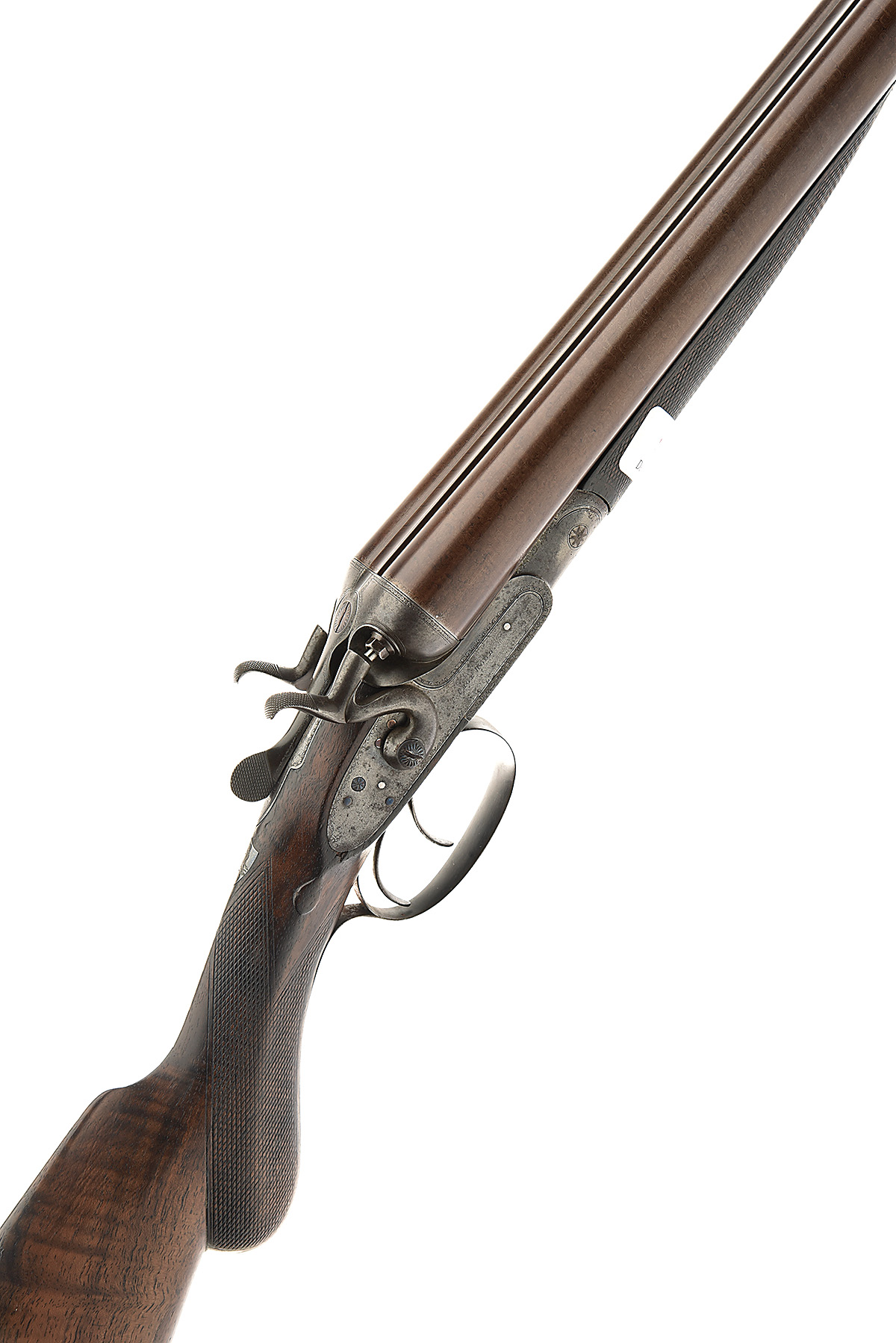 T. PAGE WOOD 12-BORE TOPLEVER HAMMERGUN, serial no. 5828, circa 1880, 28in. nitro reproved damascus barrels, 2 1/2in. chambers, bored approx. true cyl. and full choke, carved percussion fences, rebounding locks, border engraving, 13 3/4in. semi-pistolgrip stock with horn heel and toe plates, weight 5lb. 9oz.