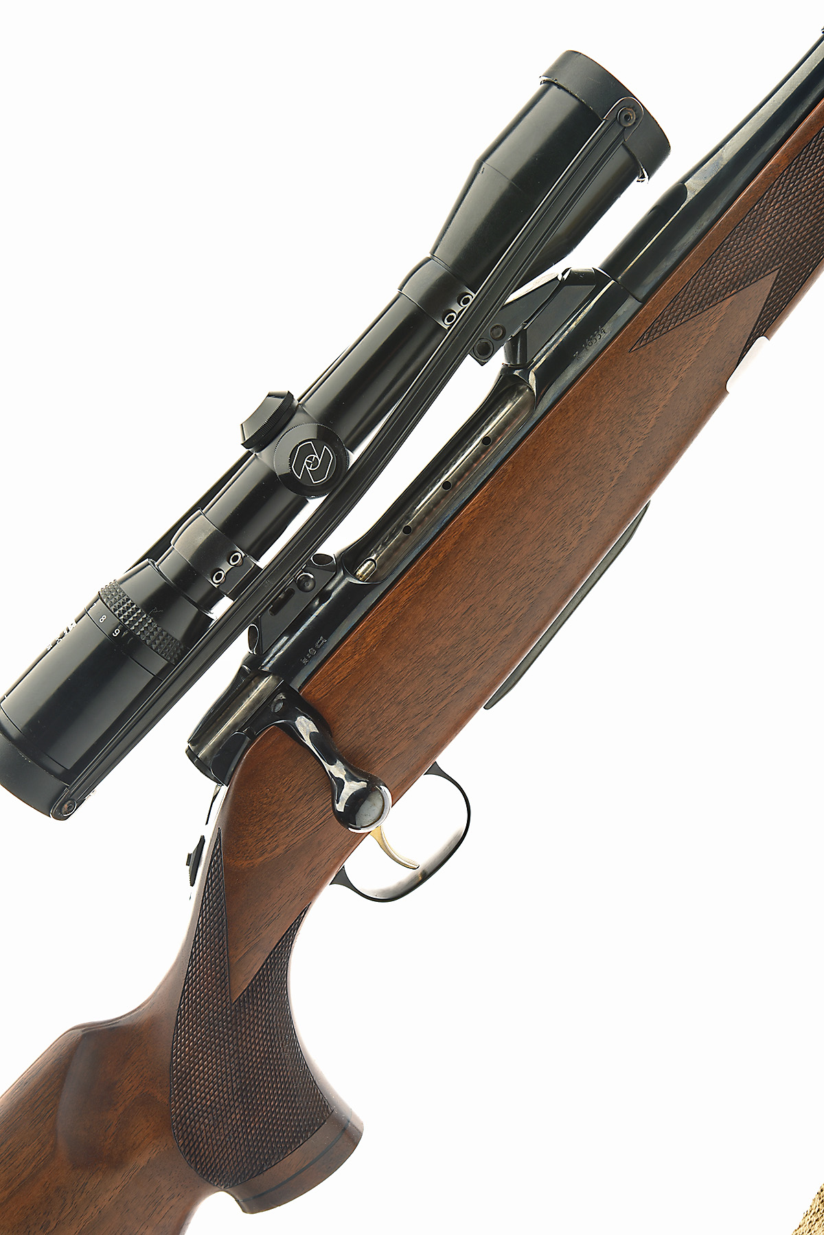 J. P. SAUER & SOHN .375 H&H MAGNUM 'SAUER 90' BOLT-MAGAZINE SPORTING RIFLE, serial no. K16334, circa 1989, 24 3/4in. barrel with open sights and ramp-mounted bead fore-sight, the receiver mounted with a Zeiss Diavari-C 3...9x36 telescopic sight, serial no. 301175, in quickly-detachable mounts, tang safety, detachable box magazine, hogsback pistolgrip stock (cracked through hand) with cheekpiece, sling swivels, 13 7/8in. pull including 1in. ventilated rubber recoil pad