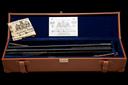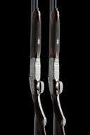 for 2006, 28in. ribless nitro barrels scroll engraved at the breech ends (slight bulges), with scroll engraved sighting flats gold-inlaid '1' and '2', 2 3/4in. chambers, bored approx. 1/2 choke in all, hold-open toplevers gold-inlaid '1' and '2', automatic safeties with gold-inlaid 'SAFE' details, non-selective single-triggers, rolled-edge triggerguards, cocking-indicators, rounded bars, fully engraved in relief with best acanthus foliage on a matt background, the lockplates carved and gold-inlaid with a single English rose and gold-inlaid with the makers name in a scrolled ribbon, bright finish overall, 15 1/4in. highly-figured replacement stocks with Prince of Wales grips, with carved steel pistolgrip-caps, weight 6lb. 5oz., in their blue velvet lined lightweight leather motor case