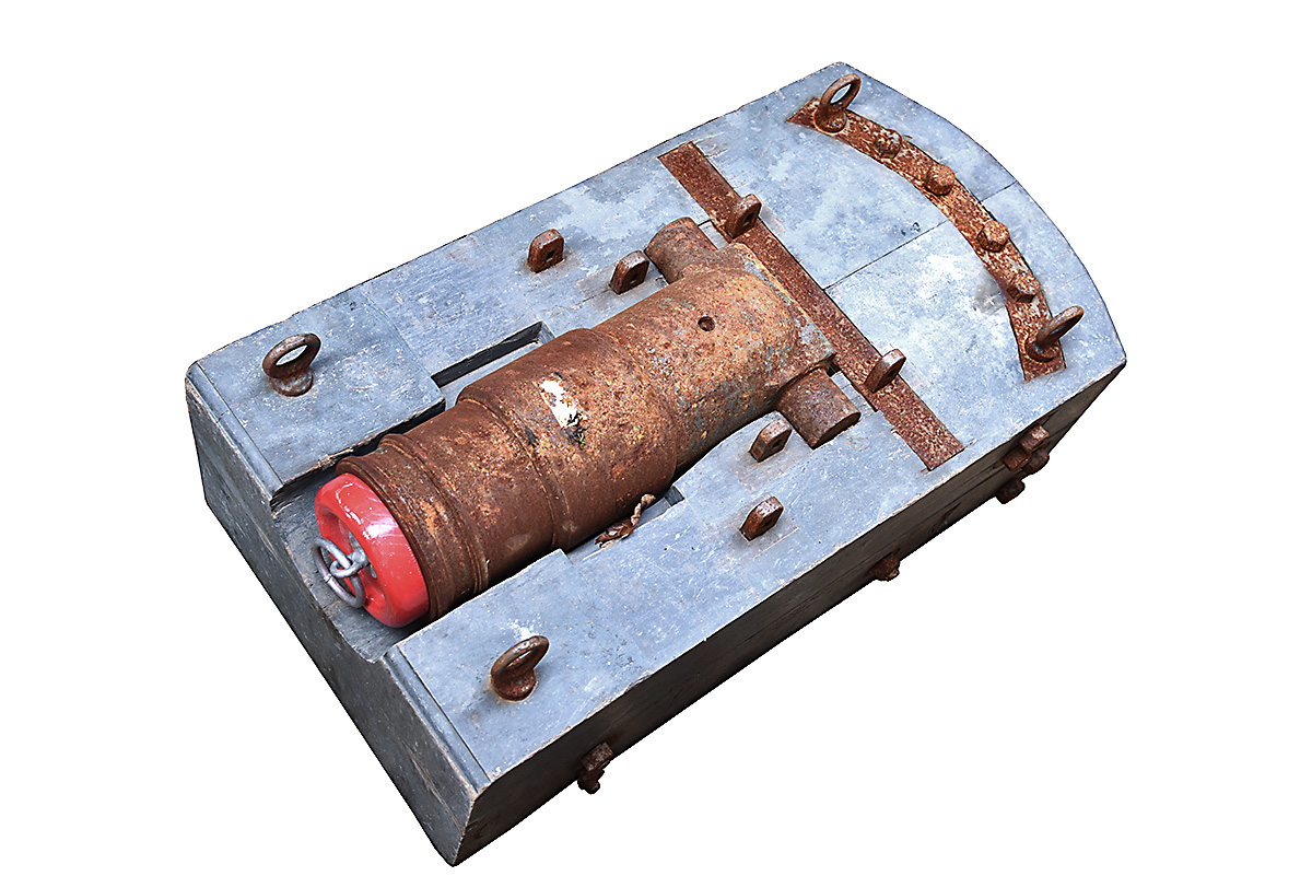 A 19th CENTURY REPRODUCTION 3in. BOMBARD MORTAR, of 18th century form, with 15 1/4in. barrel and fitted to an iron bound 28in. long oak platform and fitted with a later wood muzzle-cap