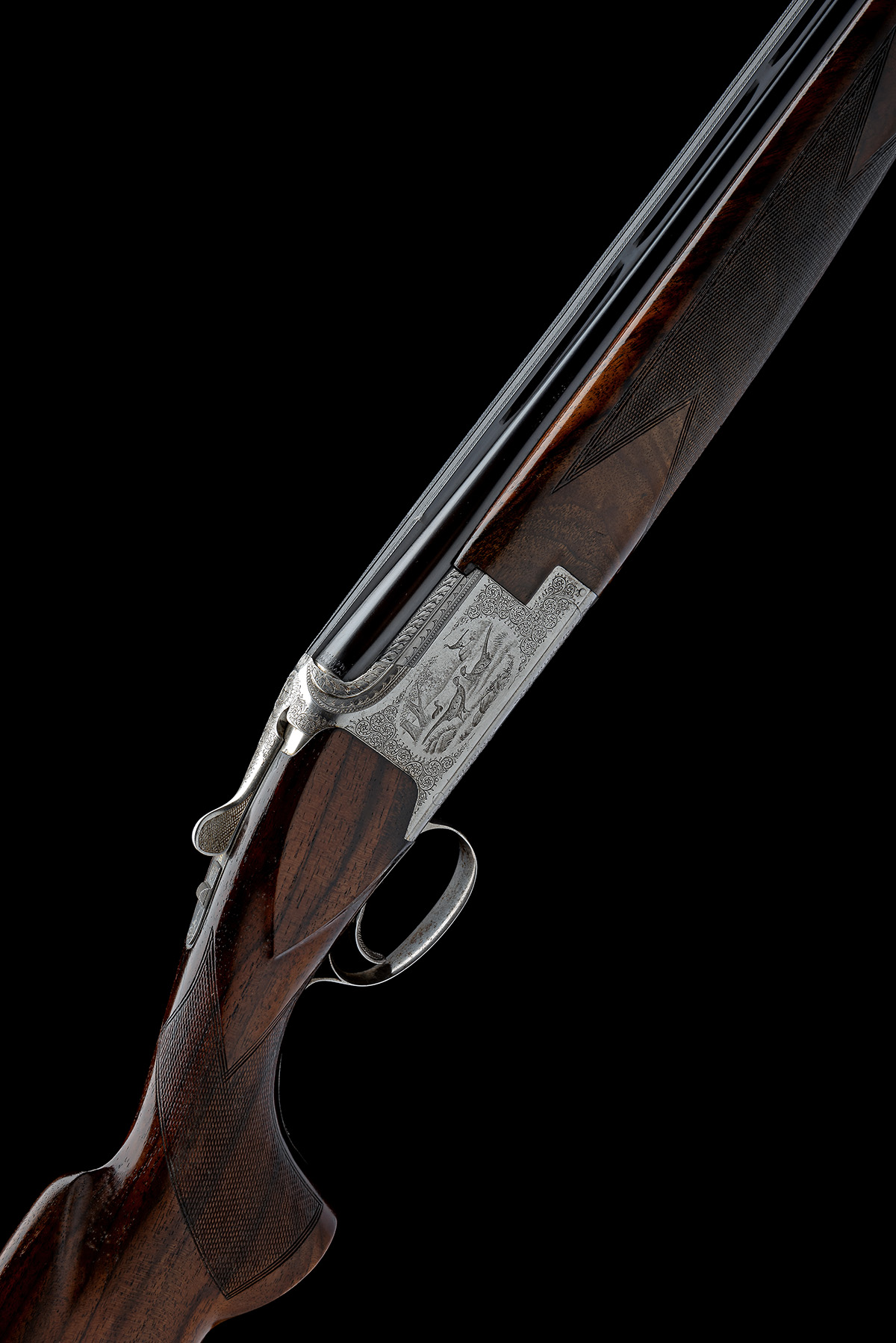 for 1973, 30in. nitro barrels (choke reproof in 1998) with 12mm ventilated matt top-rib, multichokes (no spares), hold-open toplever, manual safety with integral barrel selector switch, gold-inlaid 'O' 'U' and 'S' details, acanthus scroll engraving surrounding scenes of pheasant on the right, the left with capercaillie, brushed finish, 14 1/4in. pistolgrip stock including 1/2in. rubber recoil pad (slightly distressed), weight 7lb. 8oz.