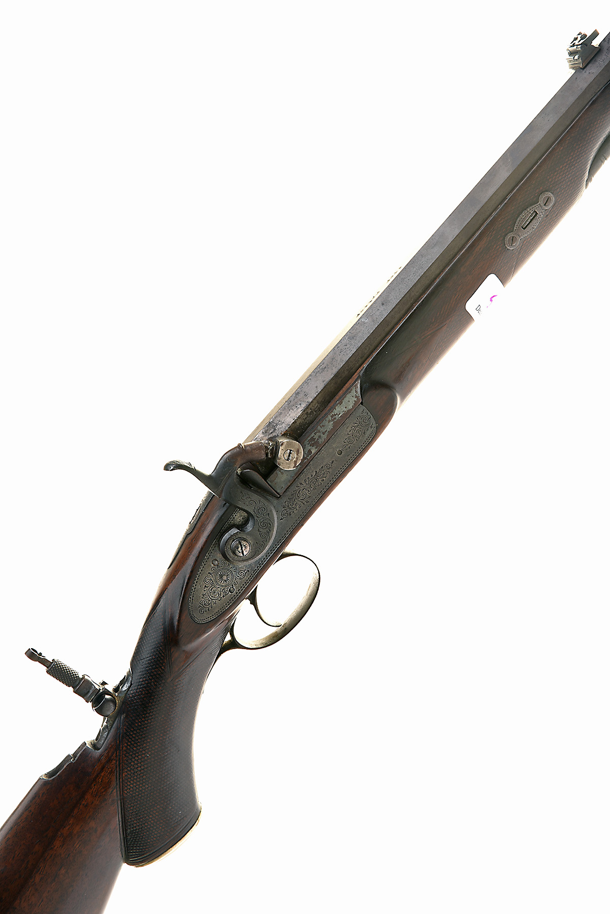 ANGLIAN ARMS .45 CAL REPRODUCTION PERCUSSION RIFLE, no visible serial number, circa 1970, 32in. octagonal black powder only reproved barrel (in 2025), flip-up open rear sight, dove-tailed bead fore-sight, the top flat marked 'ANGLIAN ARMS', bar-action lock, the stock fitted with a folding peep rear sight, border and acanthus scroll engraving, blued finish, chequered pistolgrip stock with pistolgrip cap, 14in. pull including steel buttplate, weight 9lb. 3oz.