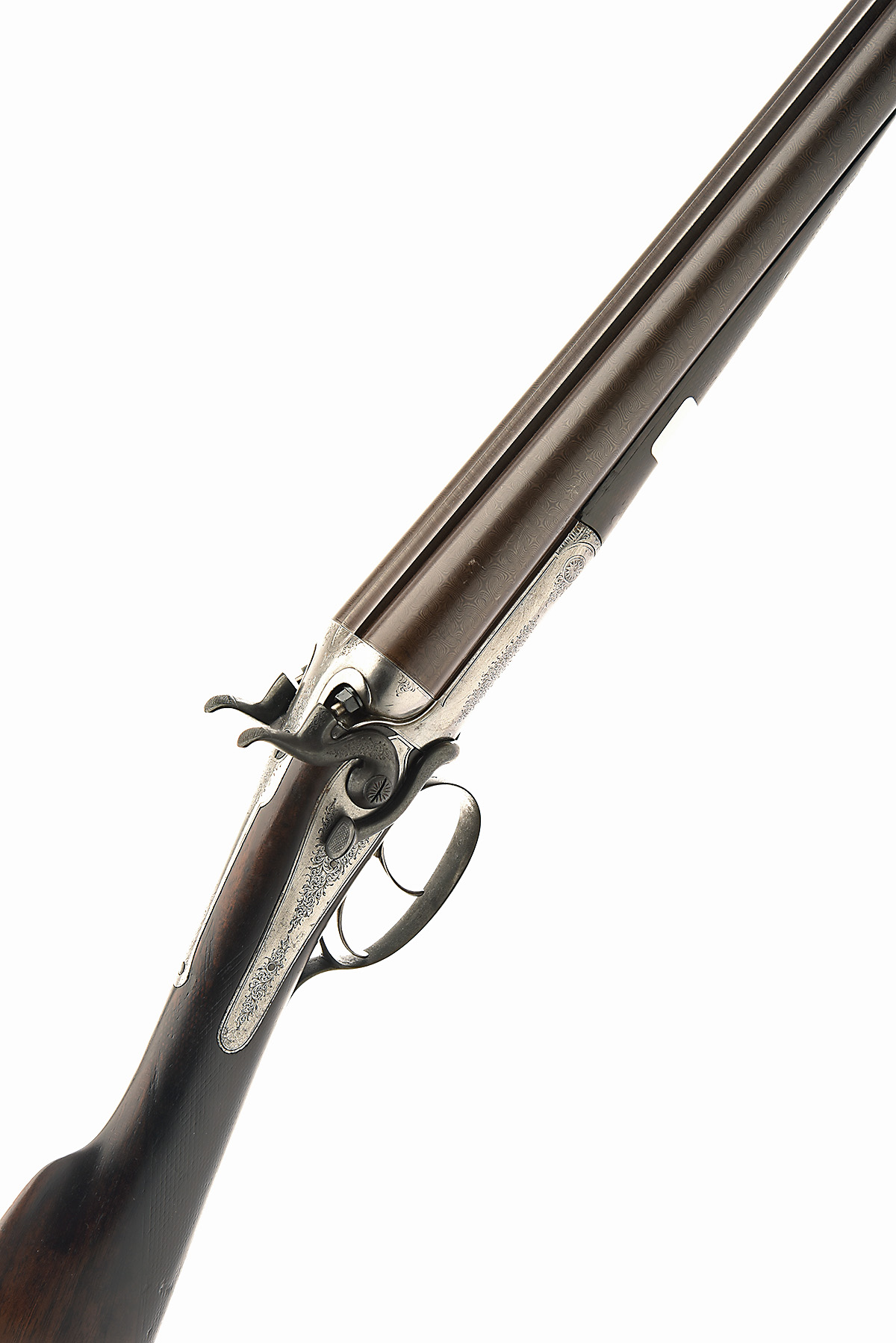 P. WEBLEY & SON 12-BORE SIDELEVER HAMMERGUN, serial no. 26275, circa 1880, 29 3/4in. black powder only damascus barrels, 2 1/2in. chambers, bored approx. 1/2 choke in both, pitted, unsigned action, rebounding back-action locks, border and acanthus scroll engraving, brushed finish, 14 1/2in. stock with steel buttplate