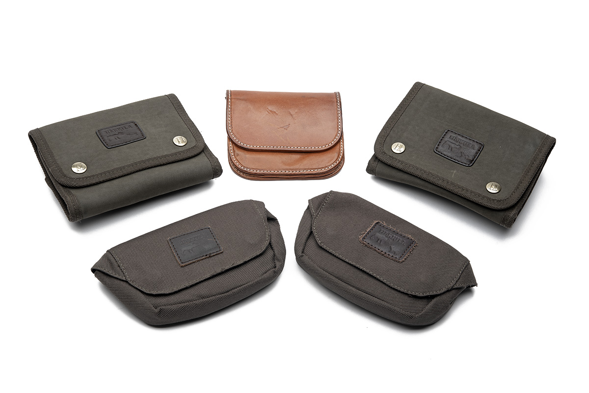 A COLLECTION OF SMALL CARTRIDGE HOLDERS, 2 x harkila canvas 2 x harkila canvas 1 x laksen brown leather 5