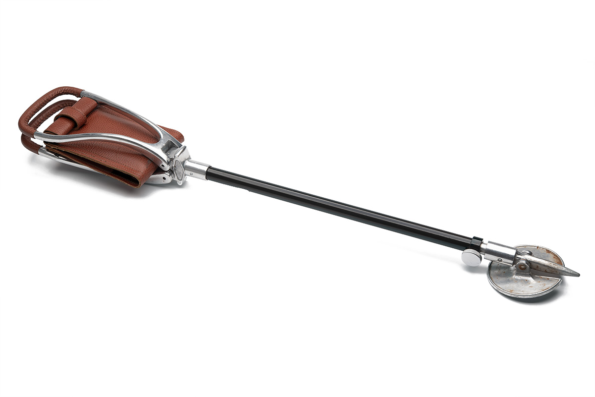 A BROWN LEATHER SEAT STICK, made in england, no brand visible