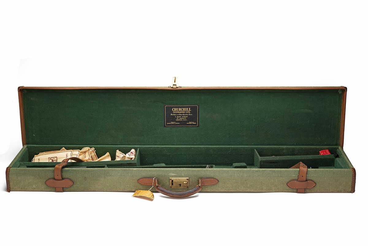 with gold-tooled Churchill (gunmakers) Ltd label, green baize interior, with cleaning rod and heads