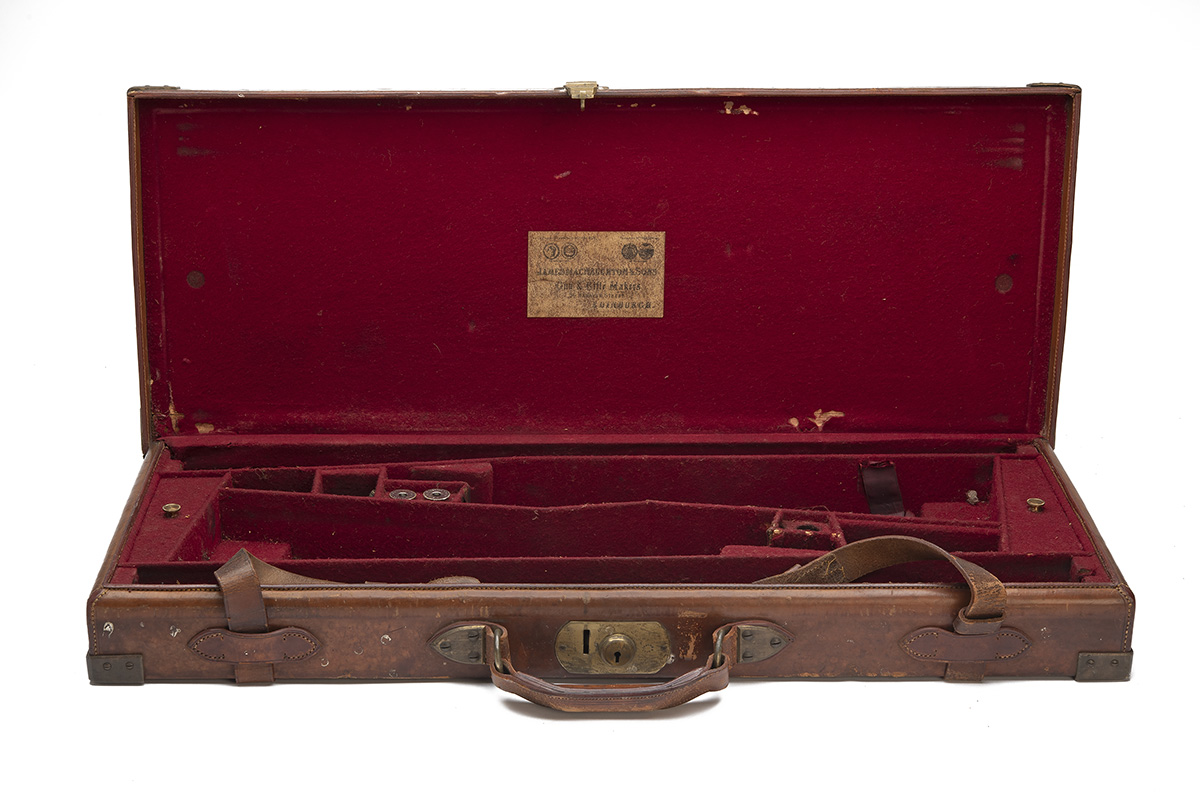 fitted for 28in. barrels, red baize-lined interior, the lid with James MacNaughton & Sons trade label, with some accessories, brass lock (key missing), lid exterior marked 'J.G.B.'