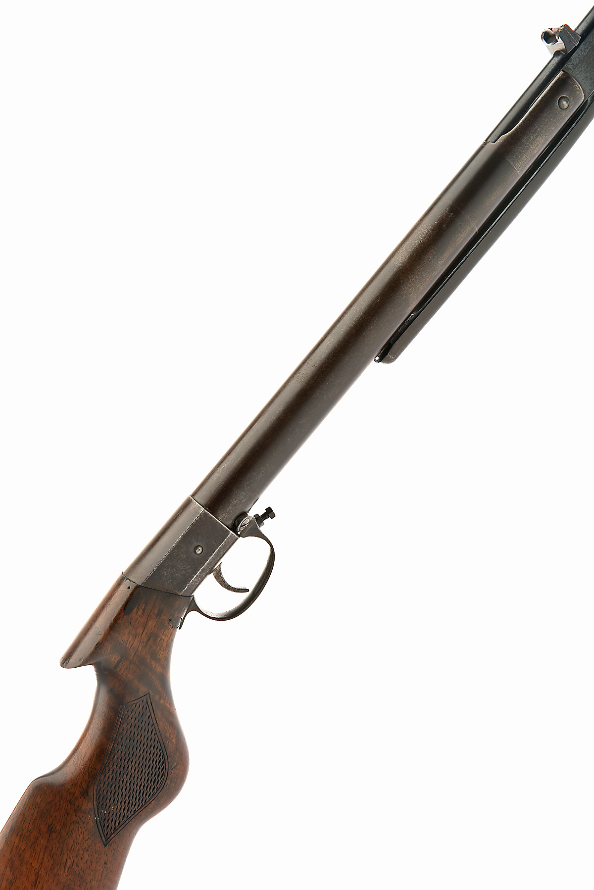 A PRE-WAR .177 BREAK-BARREL AIR-RIFLE, no visible serial number, Possibly a Midland Demon, with 19in. sighted barrel, plain air-chamber with slab-sided trigger unit, chequered walnut saw-handled butt-stock (cracked and repaired at head) and no provision for fore-end, finish thinned