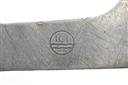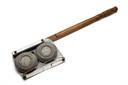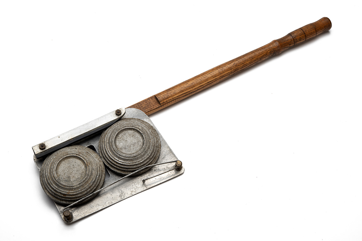 A VINTAGE ICI ALUMINIUM CLAY PIGEON THROWER, complete with two (used) aluminium clay pigeons, 24in. wooden shaft with turned handle, sprung clay reservoir for two clay pigeons, mainplate marked with the 'ICI' logo
