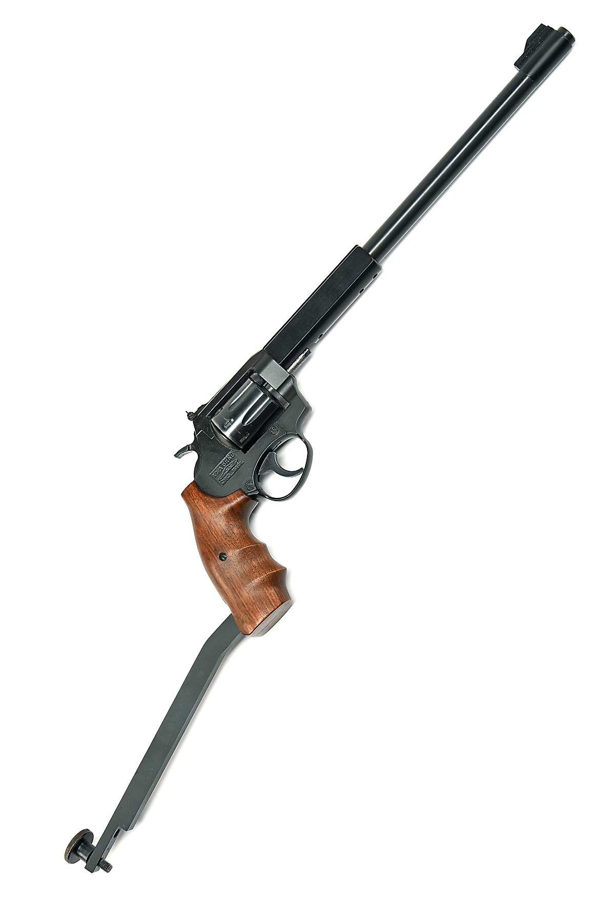 A CASED .22(L/R) BRNO KORA LONG BARRELLED REVOLVER, serial no. 207803, with blued 12in. barrel fitted with a telescopic sight rail, adjustable sights, swing-out fluted cylinder, solid frame and permanent extension bar to comply with UK legislation, in a fitted wood case with removable heel-plate and fore-end