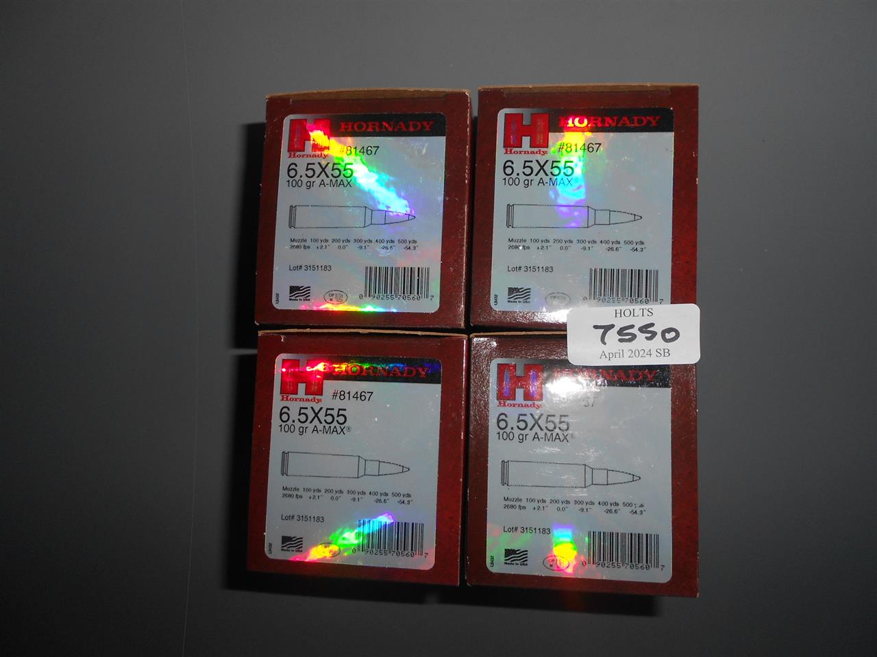 200 ROUNDS 6.5 X 55 AMMUNITION BY HORNADY #81467 100grn A-MAX BATCH 3151183 Please be advised that cartridges/ammunition, primers, primed cases, blanks and percussion caps CANNOT BE SENT ANYWHERE in the UK or EXPORTED OVERSEAS by POST or CARRIER. Due to this NATIONAL and INTERNATIONAL CARRIER rule, within 30 days of the sale date, please arrange collection with our shipping department from our Norfolk HQ. If payment and collection is not arranged within 30 days of the sale date, that will indicate that the items are not required and they will be disposed of.