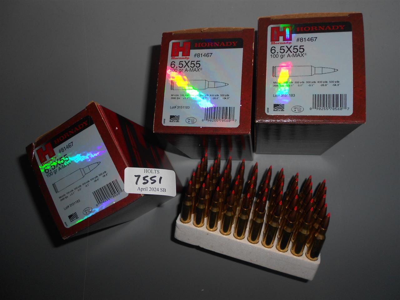 150 ROUNDS 6.5 X 55 AMMUNITION BY HORNADY, #81467 100grn A-MAX BATCH 3151183 Please be advised that cartridges/ammunition, primers, primed cases, blanks and percussion caps CANNOT BE SENT ANYWHERE in the UK or EXPORTED OVERSEAS by POST or CARRIER. Due to this NATIONAL and INTERNATIONAL CARRIER rule, within 30 days of the sale date, please arrange collection with our shipping department from our Norfolk HQ. If payment and collection is not arranged within 30 days of the sale date, that will indicate that the items are not required and they will be disposed of.