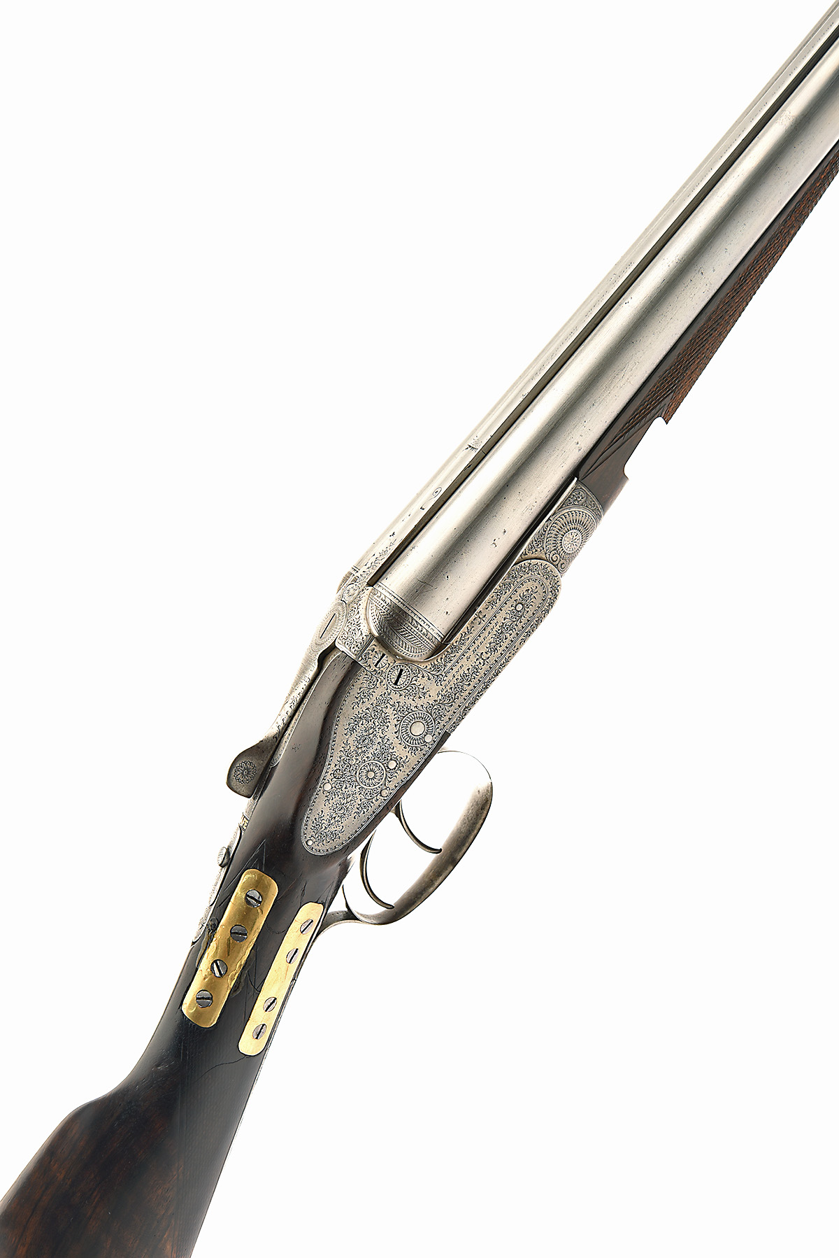HOLLAND & HOLLAND 16-BORE 1883 PATENT 'THE ROYAL' SIDELOCK NON-EJECTOR, serial no. 8768, for 1885, 28 1/8in. nitro reproved barrels (in 1964, struck off), the rib engraved HOLLAND & HOLLAND. 98 NEW BOND STREET. LONDON.' and 'WINNERS OF ALL THE "FIELD" RIFLE TRIALS. LONDON. 1883.' (faint), and '2' at the breech-end, 2 1/2in. chambers, bored approx. true cyl. and 1/2 choke, (wall thicknesses at 16 and 15 thou), Henry Holland and John Robertson patent hammerless action, patent no. 23 of 1st January 1883, the action face with W.M. Scott and T. Baker patent 'gas check' gas vents, patent no. 617 of 1882, use number 2134, toplever engraved 'HOLLAND & HOLLAND PATENT NO. 23 and '2', automatic safety with gold-inlaid 'SAFE' detail, dipped-edge lockplates, fine acanthus scroll engraving with floral bouquets, the underside with '"THE ROYAL" PATENT SAFETY HAMMERLESS', brushed finish, 14 1/4in. figured stock (cracked through & plated), including buttplate, weight 6lb. 6oz.