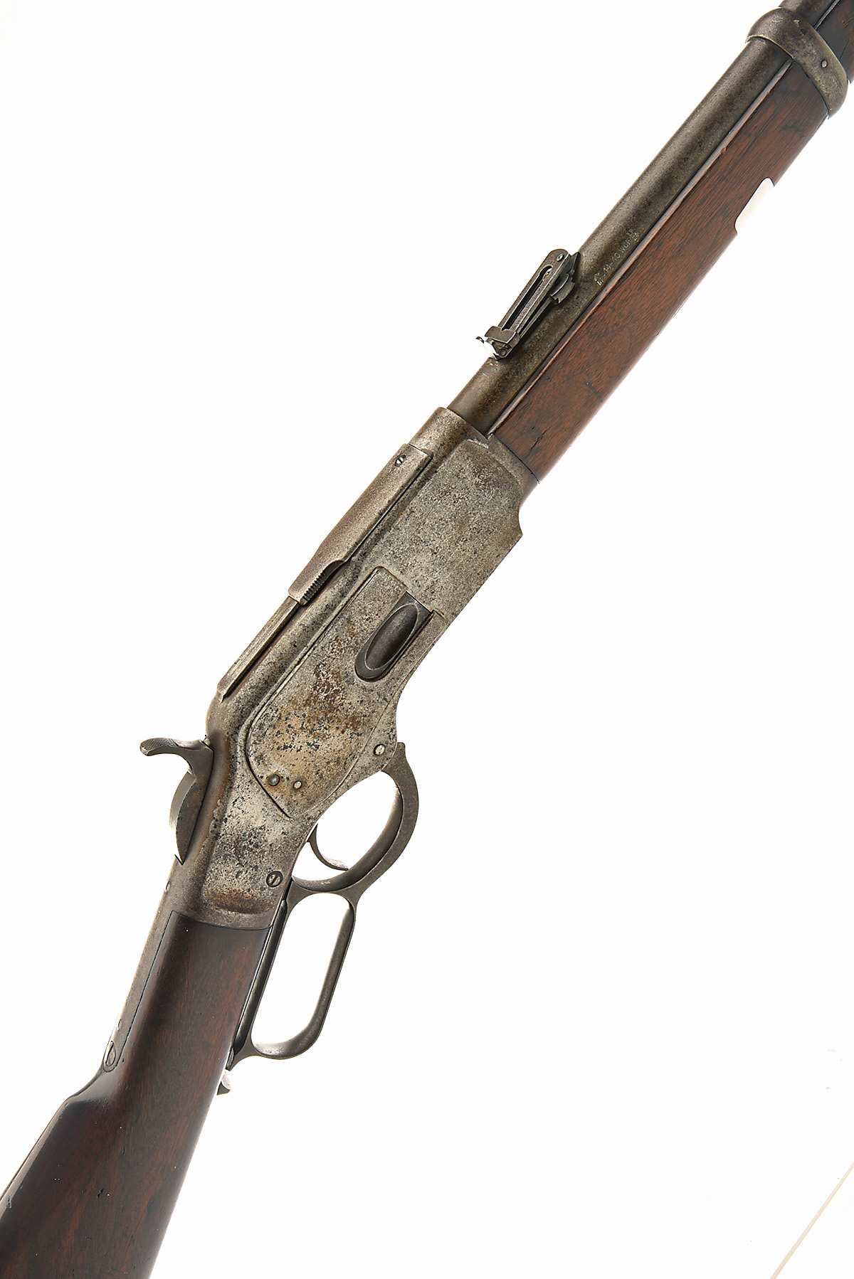 WINCHESTER REPEATING ARMS CO. .44-40 (W.C.F.) 'MODEL 1873' LEVER-ACTION REPEATING CARBINE, serial no. 248609B, for 1887, 20in. nitro reproved barrel (in 2024), with blade fore-sight, adjustable open rear sight, receiver with sliding dust cover, sprung loading gate, hammer with half-cock safety, saddle ring, patinated finish overall, 12 3/4in. walnut buttstock with steel carbine heelplate with central trapdoor, weight 7lb. 4oz.