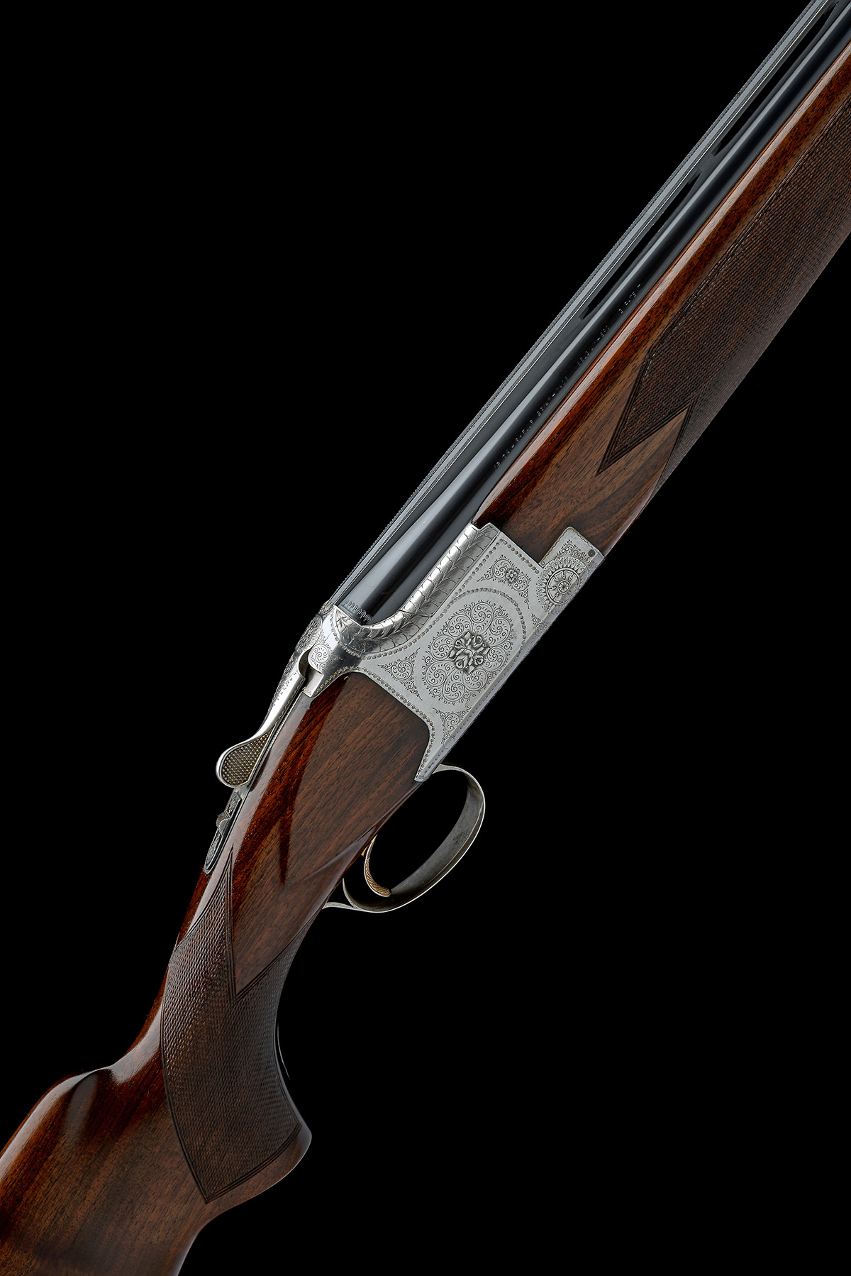 for 1975, 29 3/4in. nitro barrels with 12mm ventilated matt top-rib, 2 3/4in. chambers, bored approx. true cyl. and imp. cyl. choke, hold-open toplever, manual safety with integral barrel selector switch, gold-washed single trigger, border and acanthus scroll engraving surrounding a central floral bouquet, brushed finish, 14 1/4in. pistolgrip stock including buttplate, weight 7lb. 5oz.