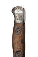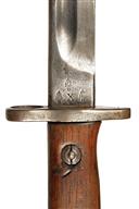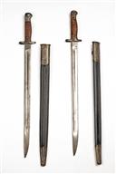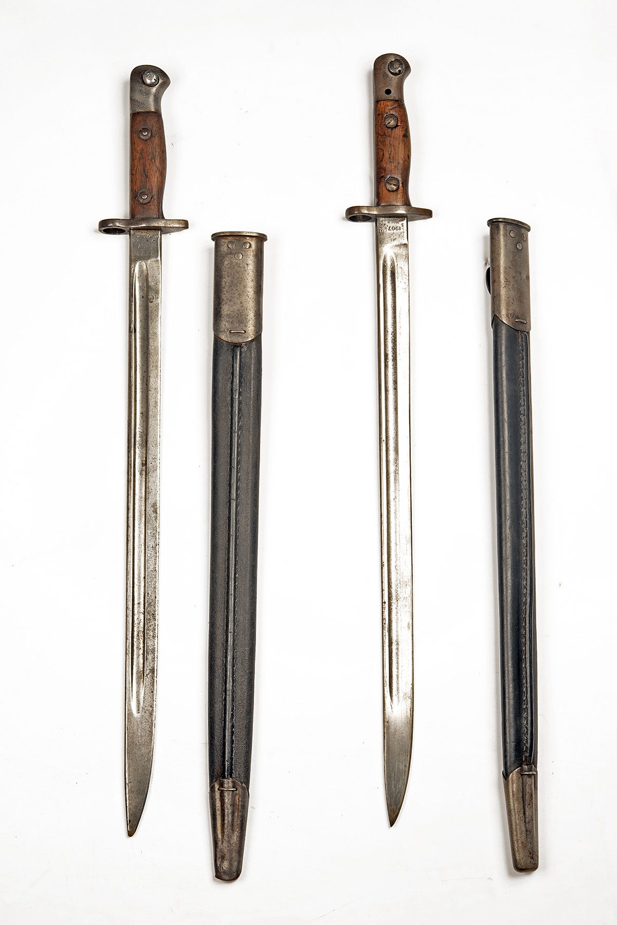 A PAIR OF GOOD PATTERN 1907 BAYONETS, early 20th Century, 17 in. single-edged blades fullered on each side, both regimentally marked, ricassos well marked, one by mole with a tear-drop button on the scabbard, the other by Wilkinson with a round button, both scabbards with tight stitching