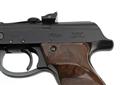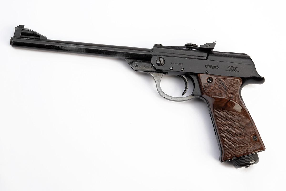 A BOXED EARLY SMOOTH-FINISH WALTHER LP53 .177 AIR PISTOL, serial no. 016254, with blacked 9 1/2in. sighted barrel (some wear to finish), blued smooth-finished receiver, mottled brown chequered grips and in its maker's card carton (worn) with cocking aid, sighting elements, cleaning rod and targets
