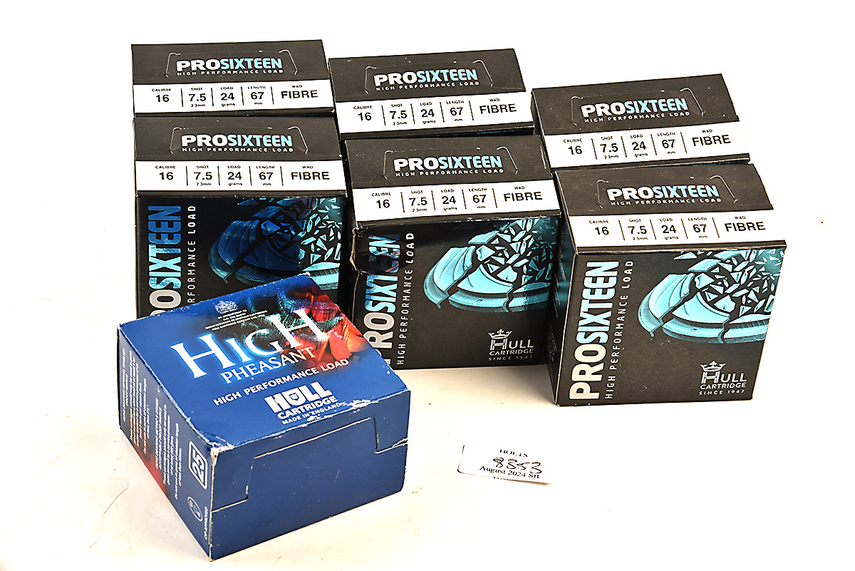 175 ROUNDS OF 16-BORE CARTRIDGES, comprising of 25 x Hull Cartridges High pheasant cartridges, 150 x Hull Cartridges, Prosixteen 16-bore 7.5 shot 25gf 67MM fibre wad cartridges.