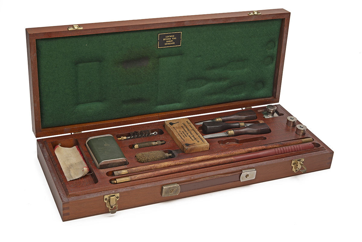A BOXED GUN CLEANING KIT BY LIGHTWOOD fitted partitioned tray with separate compartments containing turnscrews, cleaning rod and heads, nickel plated oil bottle and two pairs of snap caps, extractor tool (missing), brass lock, brass fittings