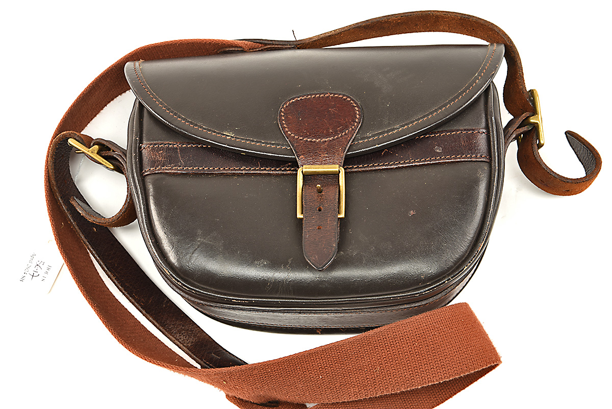 A LEATHER SUEDE-LINED CARTRIDGE BAG, with canvas and leather shoulder strap, brass fittings