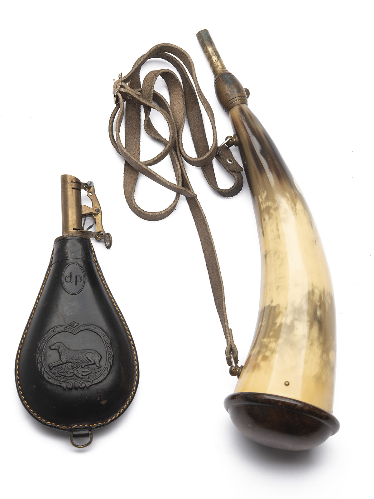 A REPRODUCTION POWDER HORN AND SHOT FLASK, horn hard plastic with brass spout and button cut-off, wooden base 14 in.; flask of black leather embossed 'dp' ( Davide Pedersoli) and framed gun-dog on both sides, 8 1/2 in. both in good, used condition