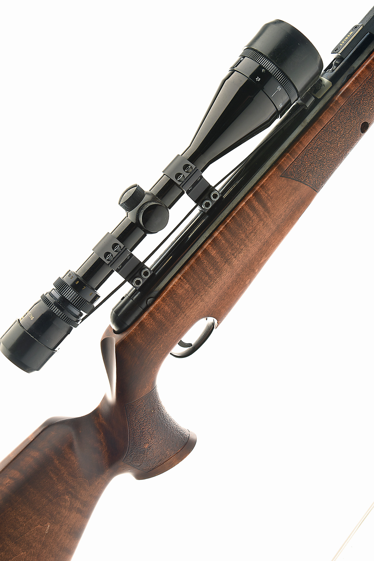A SCARCE .177 & .22 SANDWELL FIELDSPORTS CUSTOM WEBLEY & SCOTT VULCAN AIR-RIFLE, serial no's 875413 & 865812, the .177 barrel measuring 17in. and the .22 barrel 13 1/4in, both including built-on sound moderators, finely reblued air-chamber still bearing the SFS decal, custom beech right-hand sporter stock with stippled grip panels and fitted with swivels for sling, some marks to wood but generally collector's condition and fitted with a Nikko Sterling 4-12x50 telescopic sight