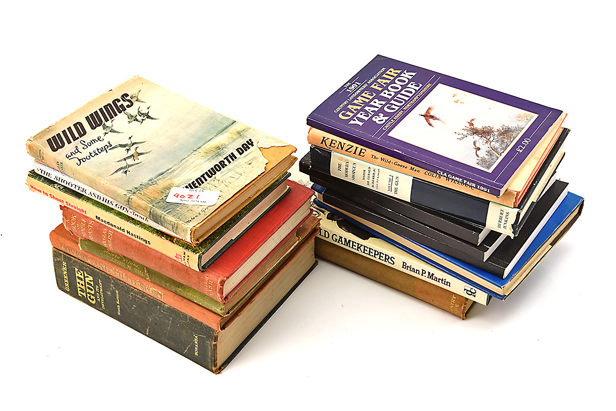 A COLLECTION OF 16 SHOOTING RELATED BOOKS, comprising of 'GUN FOR COMPANY' by E. C. Keith, 'TALES OF THE OLD GAMEKEEPERS' by Brian P. Martin, 'THE GUN AND ITS DEVELOPMENT' by W. W. Greener, 'COVERT AND FIELD SPORT' E. D. Cuming, 'NOTES ROUND THE GUN TRADE' vol 1, 2 & 3 by Bernard Hinchley, 'SOMETHING ABOUT GUNS AND SHOOTING' by Purple Heather, 'A BOOK OF NIMBLE BEASTS' by Douglas English, 'HOW TO SHOOT STRAIGHT' Macdonald Hastings, 'THE SHOOTER AND HIS GUN' by Charles Chenevix Trench, 'PURDEYS THE GUN AND FAMILY' by Richard Beaumont, 'GAME FAIR BOOK & GUIDE', 'KENZIE THE WILD GOOSE MAN' by Colin Willock, 'THE MODERN SHOTGUN' vol1 by Major Sir Gerald Burrard, 'WILD WINGS' by J. Wentworth Day. 16
