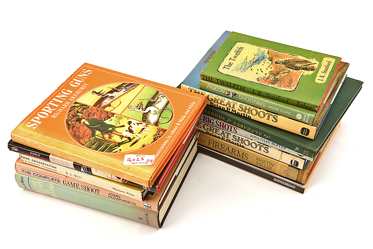 A COLLECTION OF 13 SHOOTING RELATED BOOKS, comprising of 'GUNS' by Logan Thompson, 'THE COLLECTORS ILLUSTRATED GUIDE TO FIREARMS' by Martin Miller, 'THE GREAT SHOOTS' x 2 by Brian P. Martn, 'THE BIG SHOTS' by Jonathan Ruffer, 'THE ALPHABET OF SHOOTING' by Eric Parker, 'POLLARDS HISTORY OF FIREARMS' by Claude Blair, 'THE COMPLETE GAME SHOOT' by John Humphreys, 'GAME CONSERVATION IN A CHANGING COUNTRYSIDE' by C. L Cole, ''DEBRETTS BOOK OF GAME CARDS' by lord ralph percy, 'SPORTING GUNS' by richard Akehurst, 'PIGEON SHOOTING' by Archie Coats, ' THE TWELFTH' by J. K. Stanford,