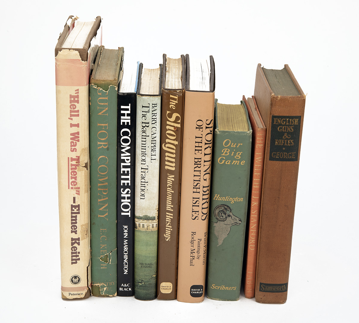 A COLLECTION OF 9 SHOOTING RELATED BOOKS, comprising of 'HELL I WAS THERE' by Elmer keith, 'ENGLISH GUNS & RIFLES' by J. N. George, 'GUN FOR COMPANY' by E. C. Keith, 'OUR BIG GAME' by Dwight W. Huntington, 'THE TWELFTH' by J. K. Stanford, 'THE COMPLETE SHOT' by John Marchington, 'THE BADMINTON TRADITION' by Barry Campbell, 'SHOOTING BIRDS OF THE BRITISH ISLES' by Brian Mcphail, 'THE SHOTGUN' by Macdonald Hastings. 9
