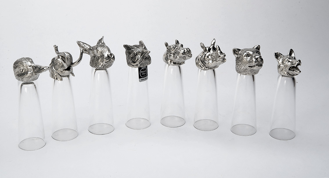 comprising of 8 stirrup cups: Hippo, Hare, Duck, Rhino, Leopard, Elephant, Fasan & Wolf