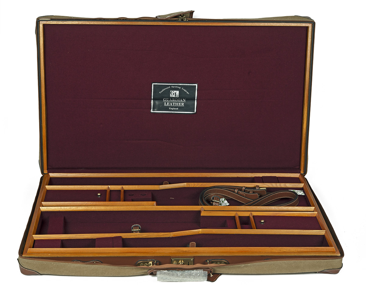 GUARDIAN LEATHER A NEW AND UNUSED BRASS-CORNERED OAK AND LEATHER PRESENTATION DOUBLE GUNCASE,