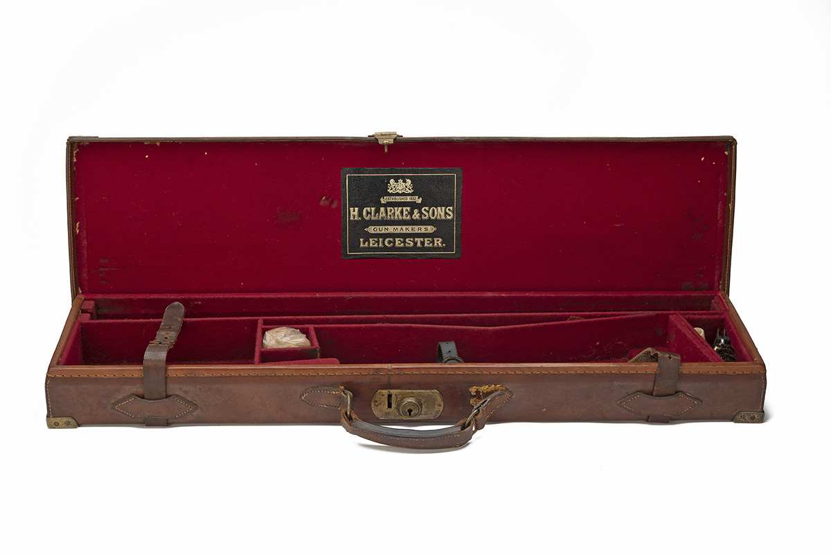 fitted for 30in. barrels, the interior lined with red baize, an H. Clarke & Sons trade label, brass lock (key missing), the lid exterior marked with 'F.W.F. L.'