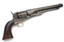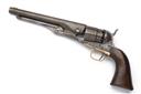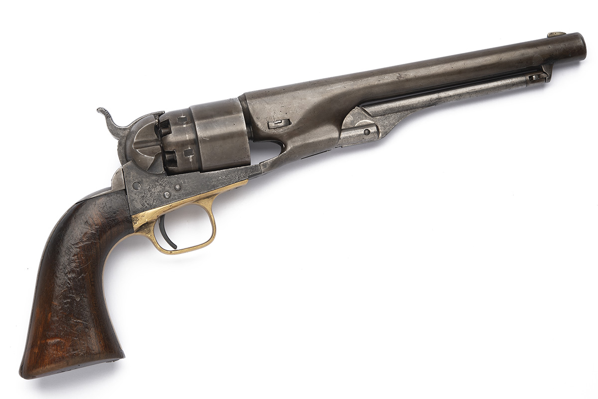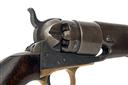 for 1862, with round 8in. barrel signed on the top 'ADDRESS COL. SAML. COLT NEW-YORK U.S. AMERICA', plain stepped six-shot cylinder scrubbed of scene and un-numbered, open iron frame marked 'COLTS PATENT', brass trigger guard bow and iron back-strap, smooth walnut grip, refinished