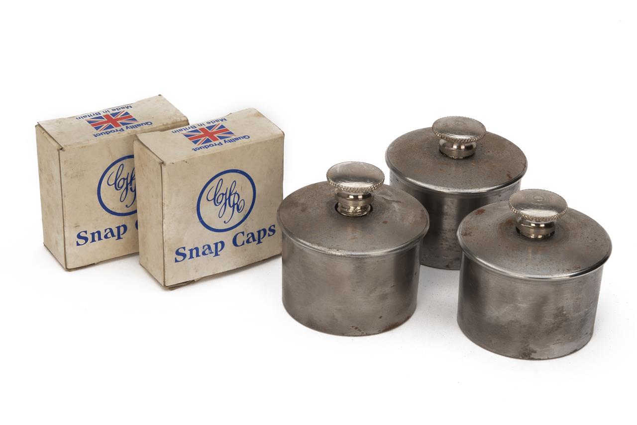 THREE LARGE (W.W. GREENER TYPE) GUNCASE OIL BOTTLES, WITH TWO SETS OF SNAP-CAPS, snap-caps boxed and signed W.W. Greener,