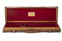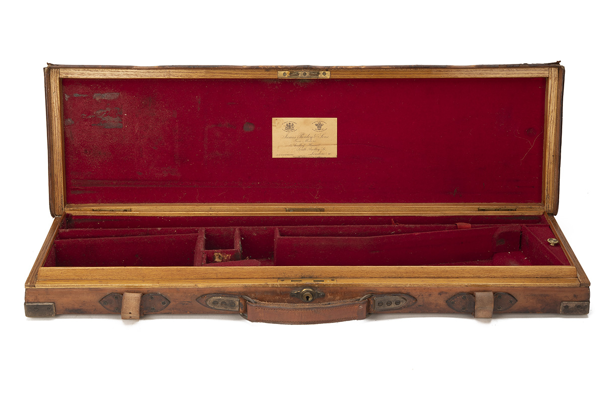JAMES PURDEY & SONS A BRASS-CORNERED OAK AND LEATHER SINGLE HAMMERGUN CASE,