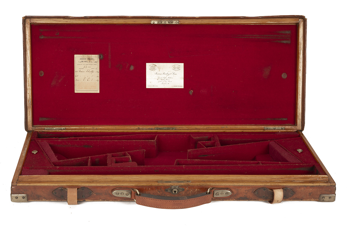 JAMES PURDEY & SONS A BRASS-CORNERED OAK AND LEATHER DOUBLE GUNCASE,