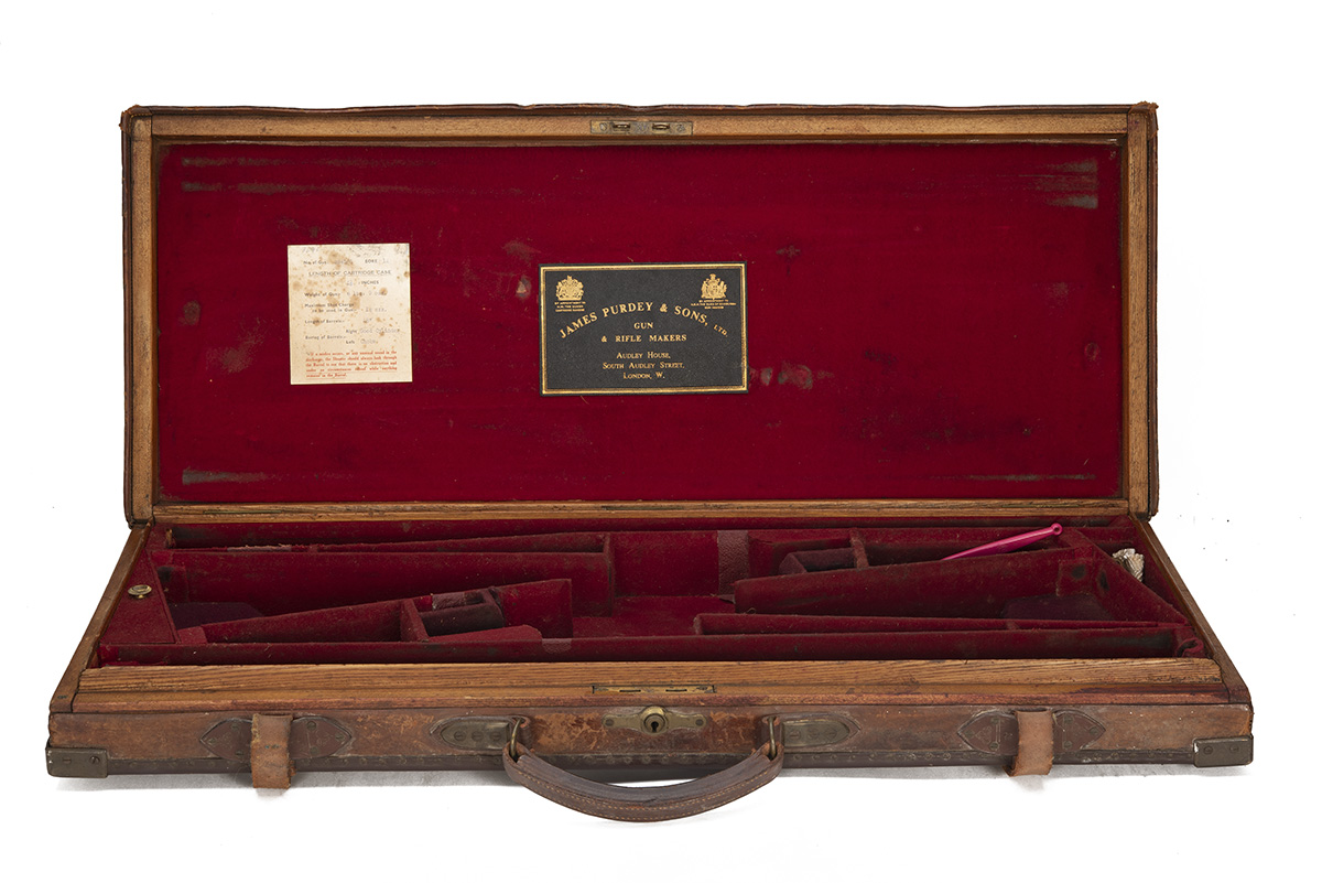 fitted for 30in. barrels, the interior lined with red baize, a gold-tooled James Purdey & Sons trade label, central brass push-button lock (key missing), the lid exterior with a blank brass escutcheon, leather marked 'M.C.B.', leather repairs around all corners
