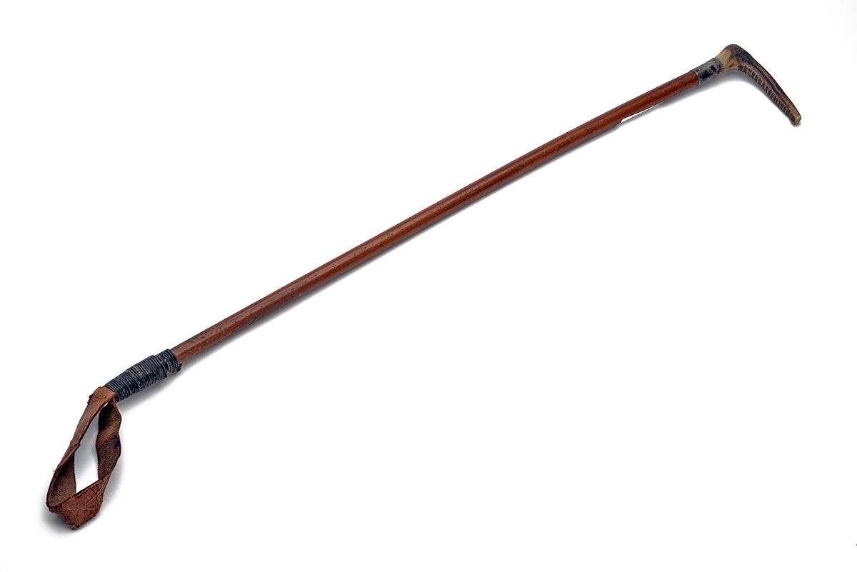A VINTAGE WOODEN RIDING CROP WITH STAG ANTLER HANDLE INSCRIBED WITH THE INITIALS H.F.H.B,