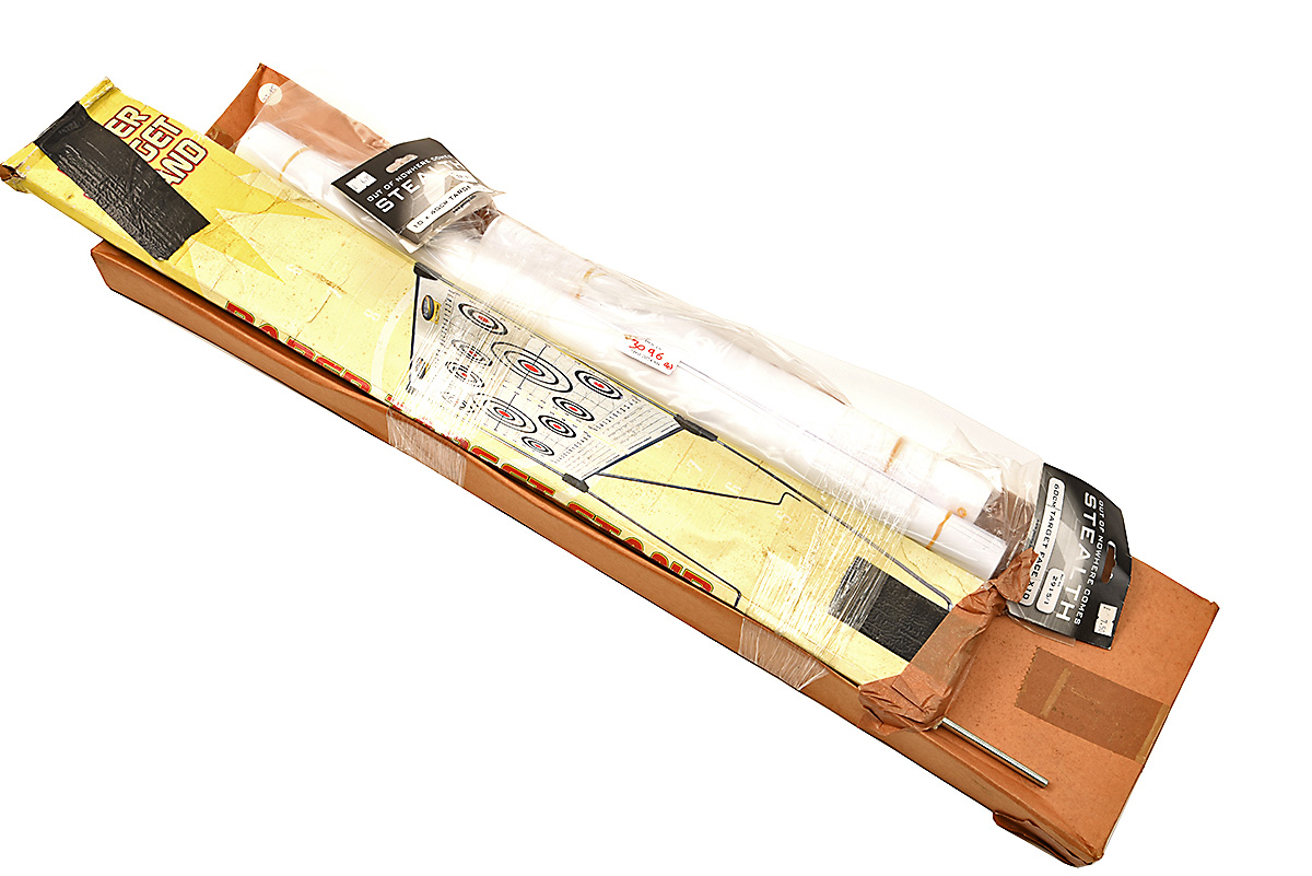 A PAIR OF PAPER TARGET STANDS WITH PAPER TARGETS, includes the 2 stands, a spinning target, along with 2 packs of 10 targets measuring 40cm 4