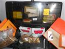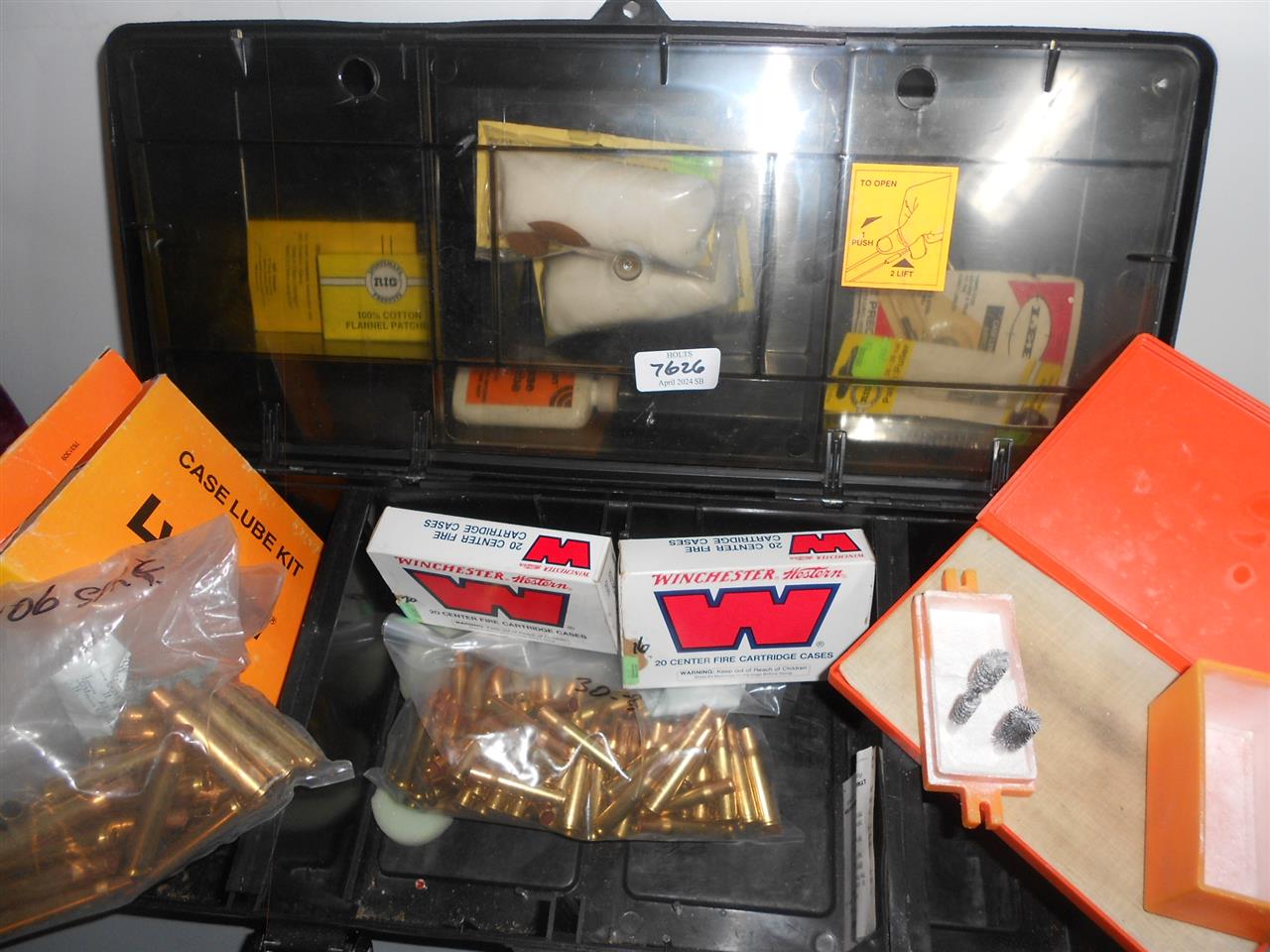 A SHOOTERS ACCESSORY BOX ENCLOSING SOME RELOADING ITEMS, NEW 30-30 AND 30-06 CASES, LUBE TRAY AND OTHER ITEMS LISTED BELOW,