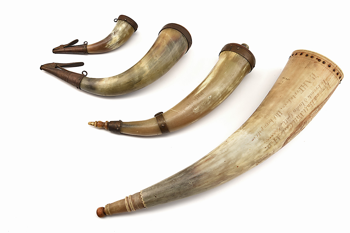 A COLLECTION OF FOUR HORN POWDER FLASKS, 4